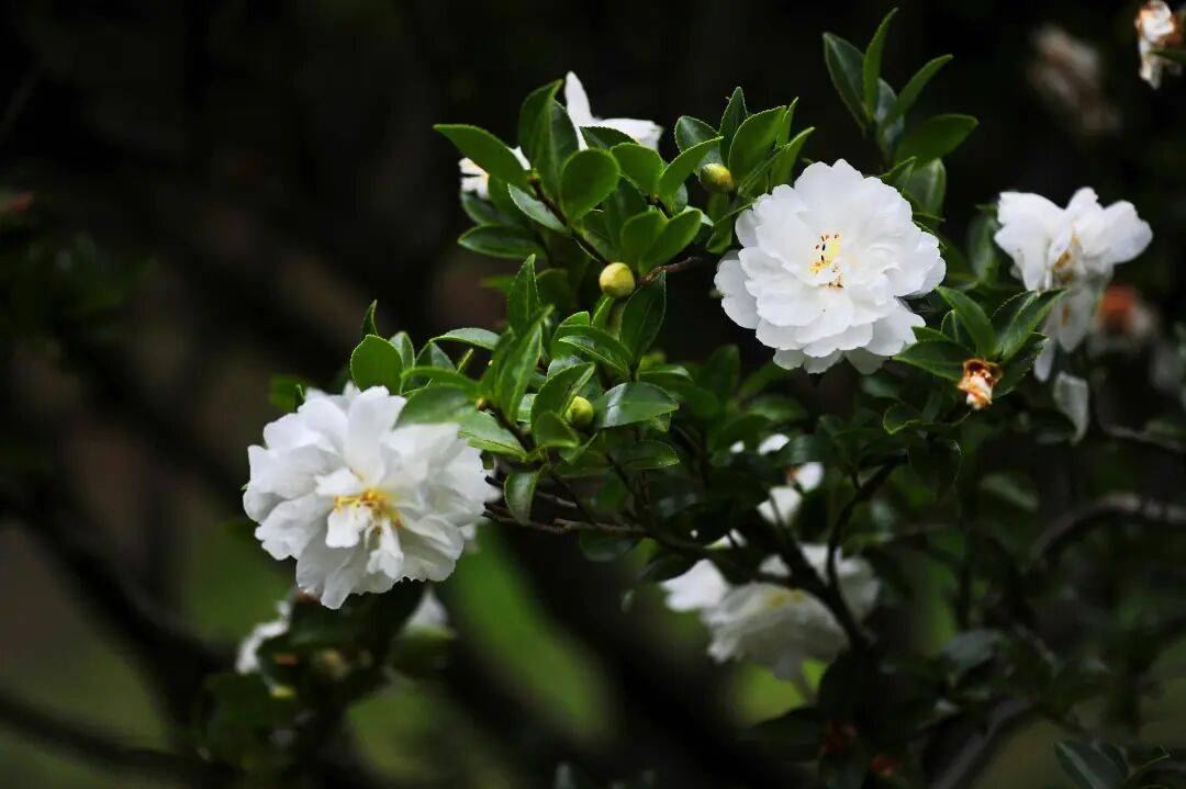 早花品种(12月底—次年1月):“早牡丹”“牡丹魁”“菊瓣”“雪娇”“粉通草”等,主要分布于茶花园接待室片区、太和宫及铜文化广场。